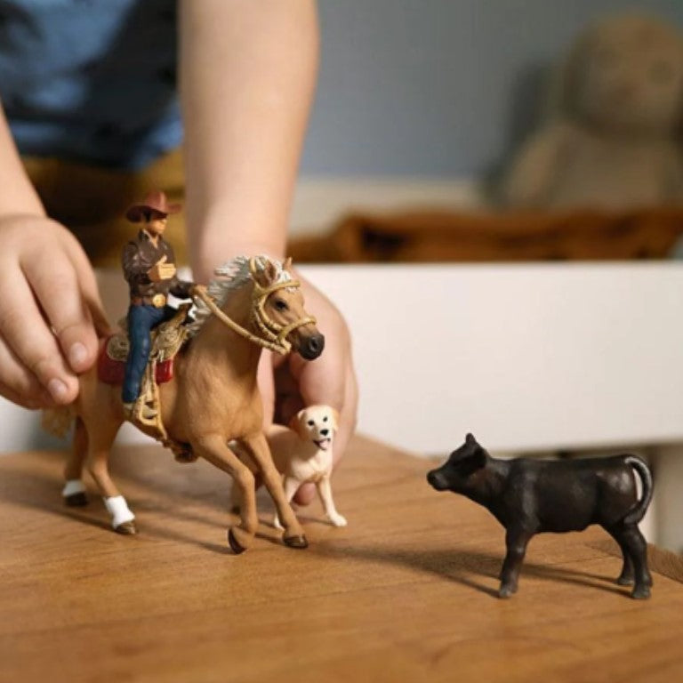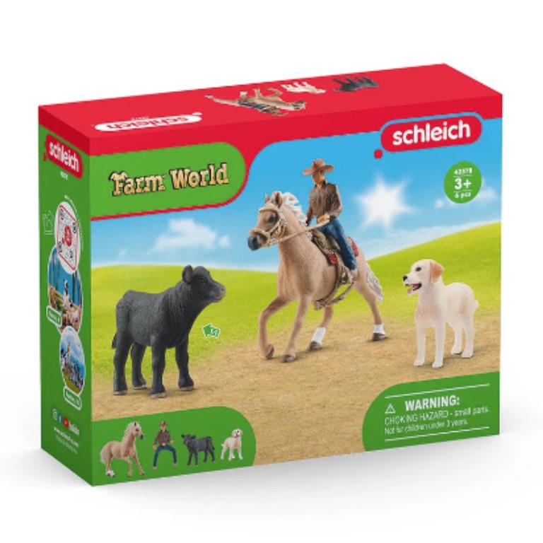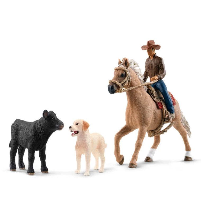 Conçu pour les enfants qui rêvent de la vie au ranch, cet ensemble de jeu comprend un jouet Quarter Horse, une figurine de cowboy, une figurine de veau, un jouet Golden Retriever, ainsi qu'une selle et une bride. Recommandé pour les petits cowboy âgés de 3 ans et plus.
