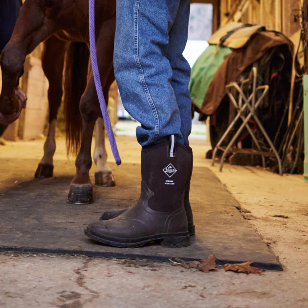 Bottes Muck Chore Western pour homme. Le néoprène classique des Muck Boot s'adapte aux contours uniques de votre pied, rendant ces bottes fiables, souples et 100 % imperméables. Le revêtement en caoutchouc est facile à nettoyer, tandis que la doublure XPRESSCOOL™ garde les pieds au frais et au sec. Le talon moulé et le crampon inférieur de la semelle extérieure empêchent votre pied de se coincer dans les étriers. Ces bottes robustes sont dotées d'un bout carré et de sangles latérales pour les enfiler.