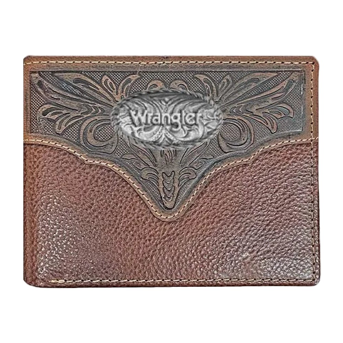 Portefeuille Wrangler à deux volets. Cuir vieilli avec empiècement en cuir western embossé et logo Wrangler concho.