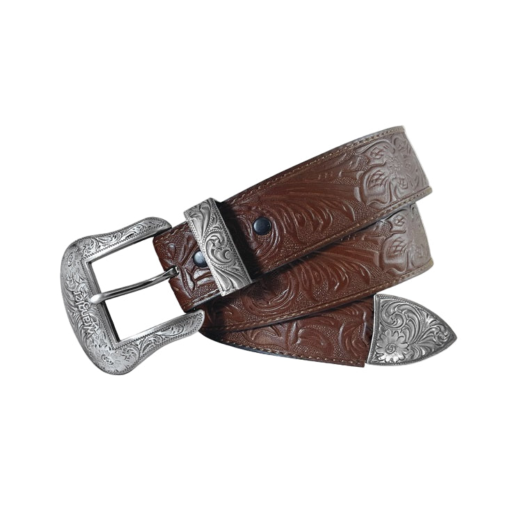 Ceinture Wrangler en cuir à motif floral gaufré, avec bords cousus ton sur ton et boucle Wrangler en trois parties, finition argentée.