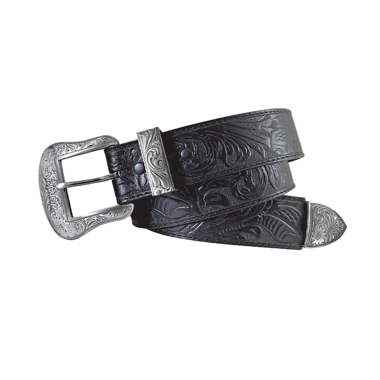 Ceinture en cuir Wrangler gaufré floral avec bords cousus. Boucle en 3 pièce. 7 trous d'extrémité pour un meilleur ajustement sur tous les types de corps.