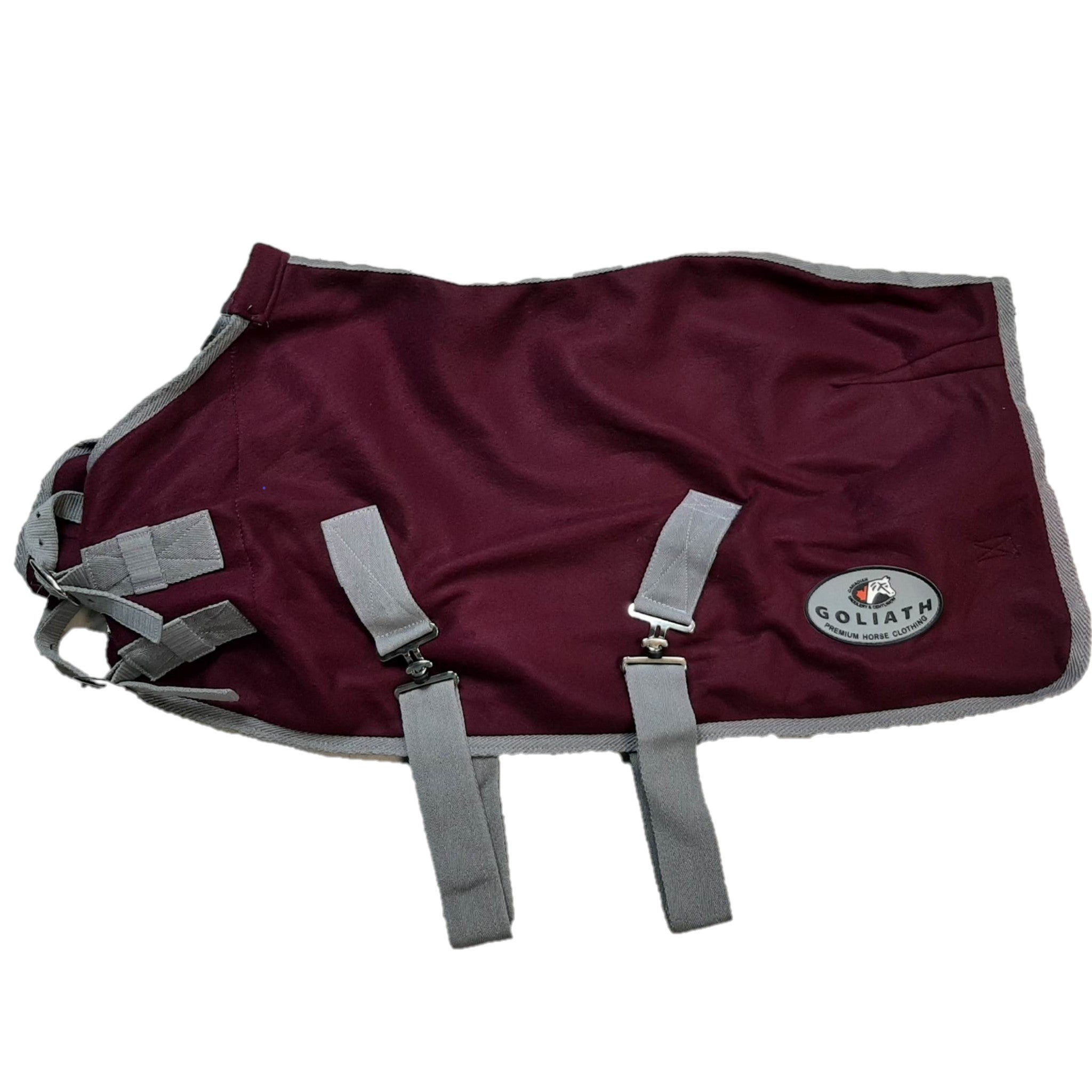 Couverture de polaire pour miniature de Goliath. Double fermeture à boucles au poitrail avec velcro. Couleur bourgogne avec détails gris