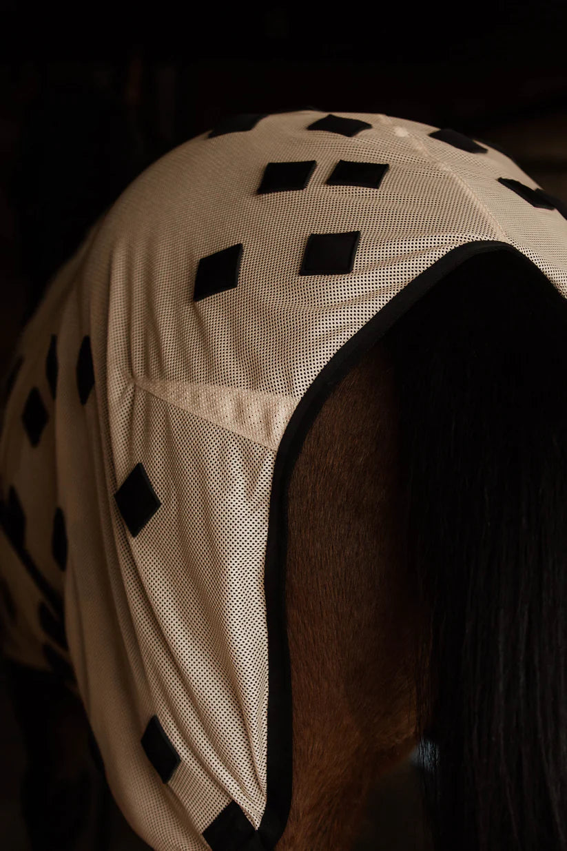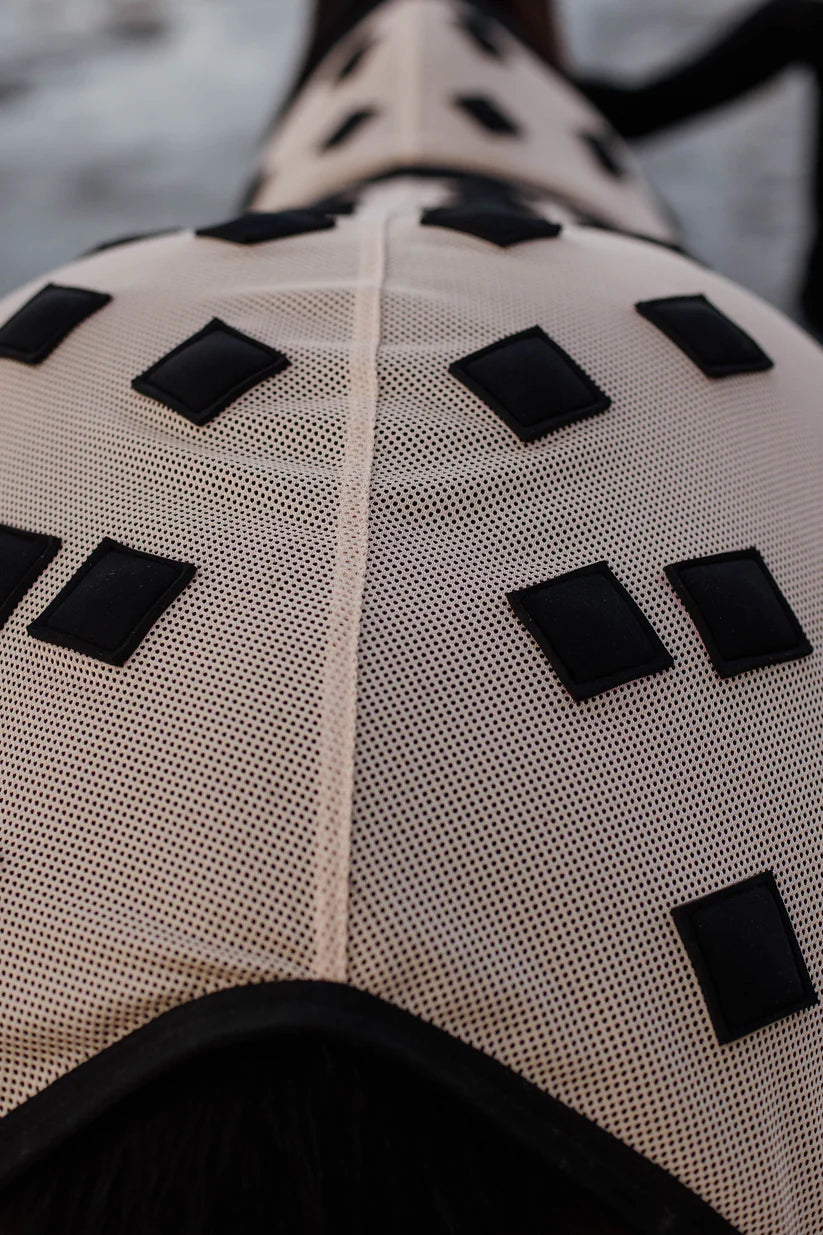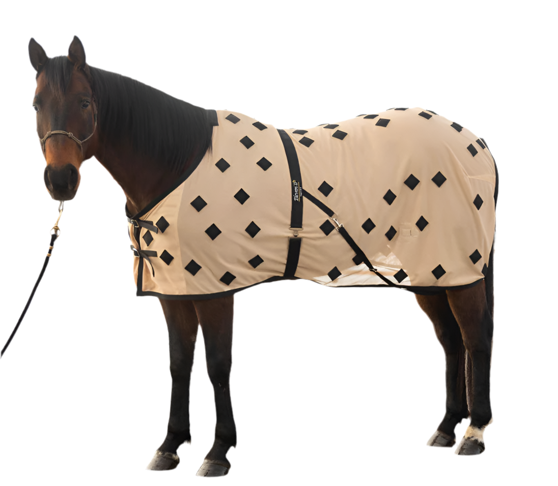 Notre maille comprend 88 aimants de qualité thérapeutique orientés avec la polarité nord et placés en fonction des points d'acupuncture et des vaisseaux sanguins du cheval pour des résultats plus rapides.