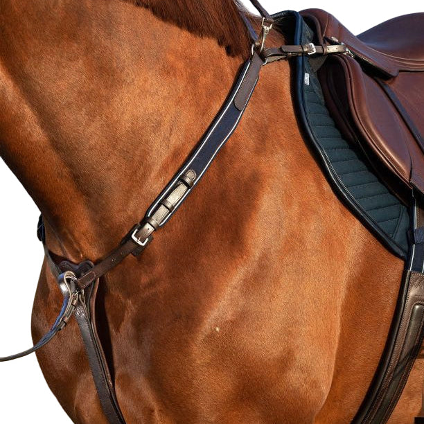 La martingale élastique Rambo Micklem est tout simplement magnifique. Cette martingale à 3 points d'attaches et de conception ergonomique offre plus de confort et de sécurité lors des épreuves de sauts et de cross-country. Le 3 points de fixation offre une meilleure liberté de mouvement. Possibilités d'ajustement maximales sur les côtés de l'encolure, la sangle ventrale et les fixations de selle. Poignée de cuir supplémentaire amovible sur le garrot pour apporter de l'aide au cavaliers débutants. Les clips supérieurs se fixent à l'anneau en D de la selle ou vient avec des fixations pour les étriers qui offrent un point de fixation plus sûr et plus sécurisé sans endommager la selle.