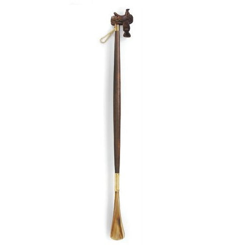 Cuillère à chaussure longue portée avec poignée simulée "selle western" moulée acétate de cellulose avec un manchon en laiton et une chaîne au col pour faciliter le stockage. Complété par un manche en bois de hêtre teinté de laque brune avec une finition lisse. La languette est en corne et moulée en acétate de cellulose matériau extrêmement résistant pour une utilisation durable. Mesure 27" de longueur avec un ressort en laiton plaqué or facile à utiliser au-dessus de la languette pour une utilisation en flexion.