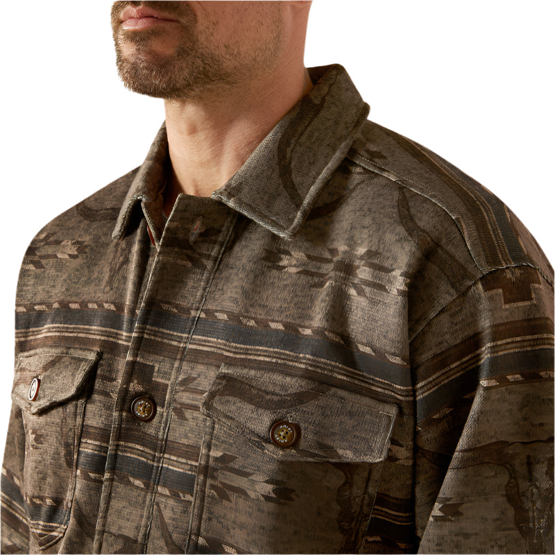 Chemise Shacket Ariat Caldwell pour homme. À la fois surchemise et veste, la veste Caldwell est suffisamment structurée pour être élégante au dîner, mais suffisamment épaisse pour servir de manteau. Son tissu polaire lui confère une sensation de confort, tandis que l'imprimé Sud-Ouest ajoute une touche visuelle subtile.