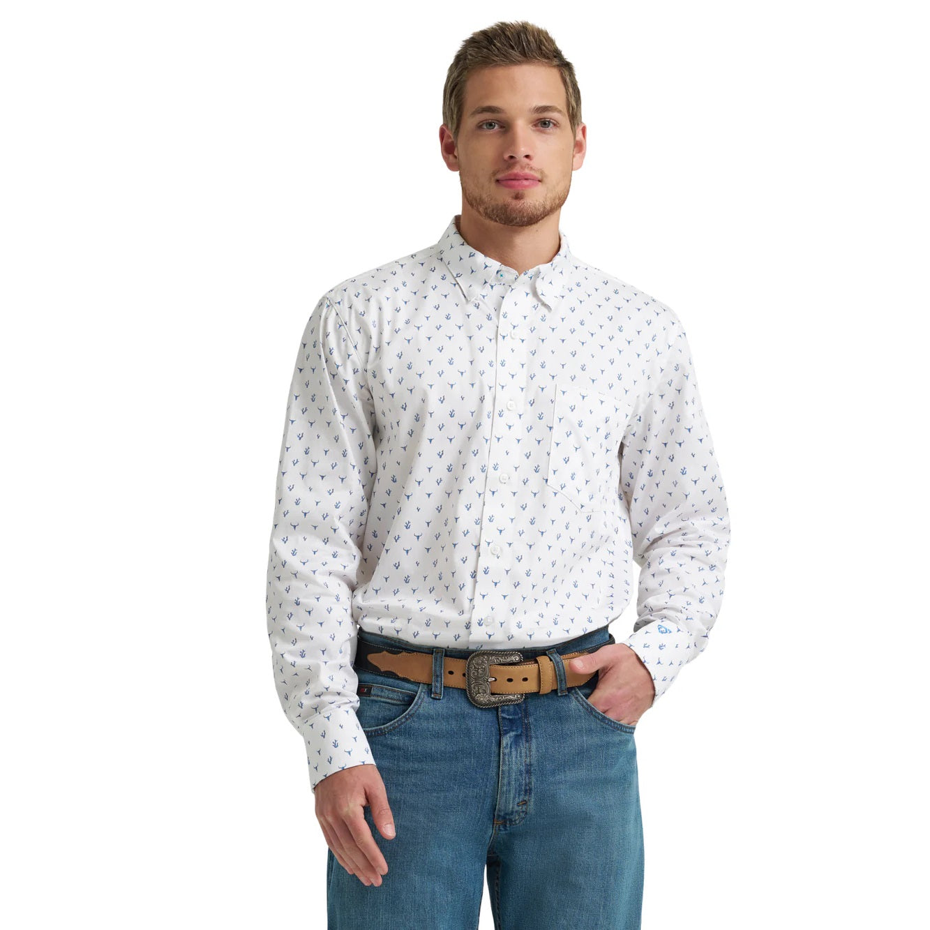Chemise WranglerXCody Johnson pour homme. Motifs de mini cactus et longhorn bleus.
