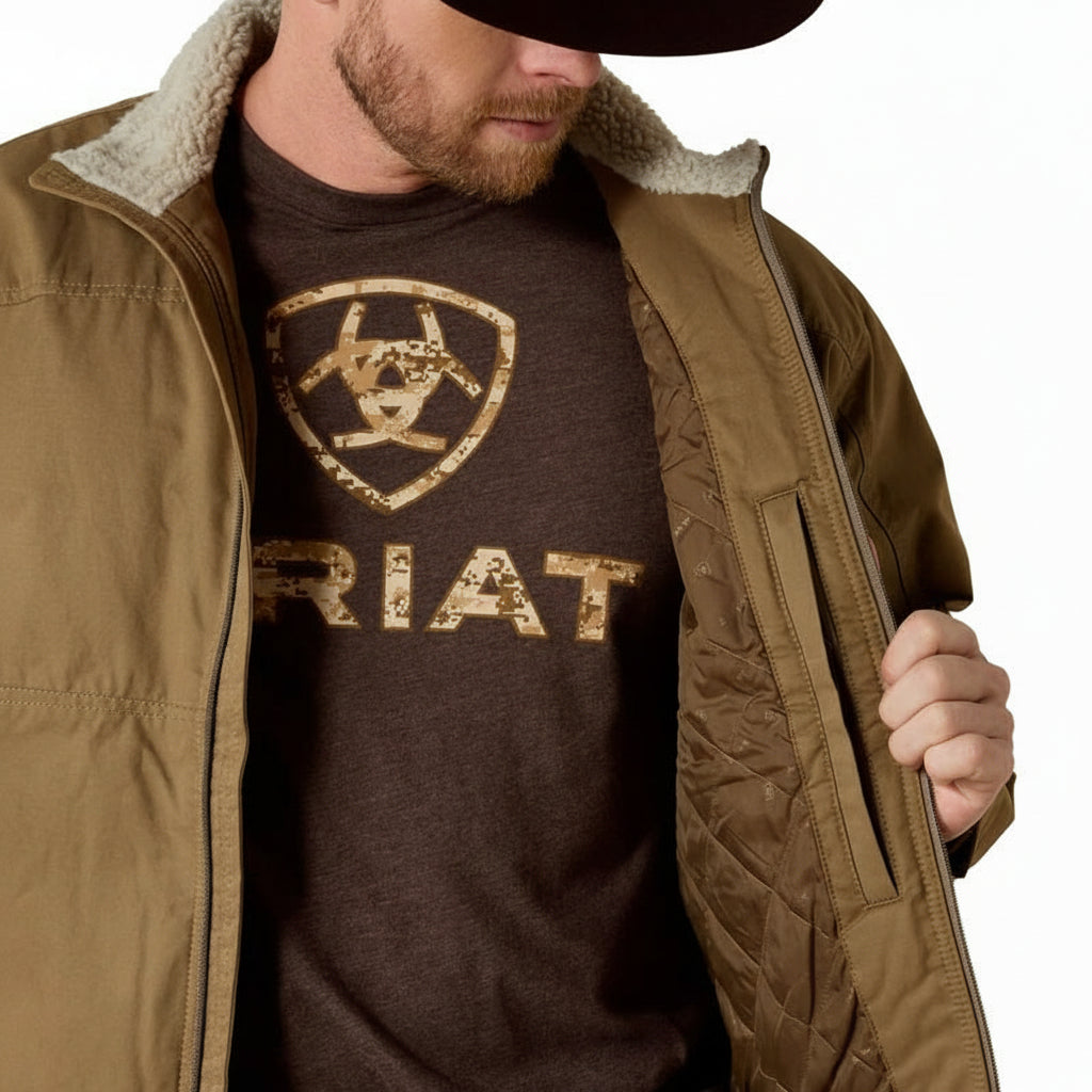 Manteau Ariat Grizzly Canvas pour homme. Légèrement isolé et déperlant, cet manteau robuste vous protège du vent, de la pluie et du froid. Ses multiples poches zippées sont conçues pour tout ranger.
