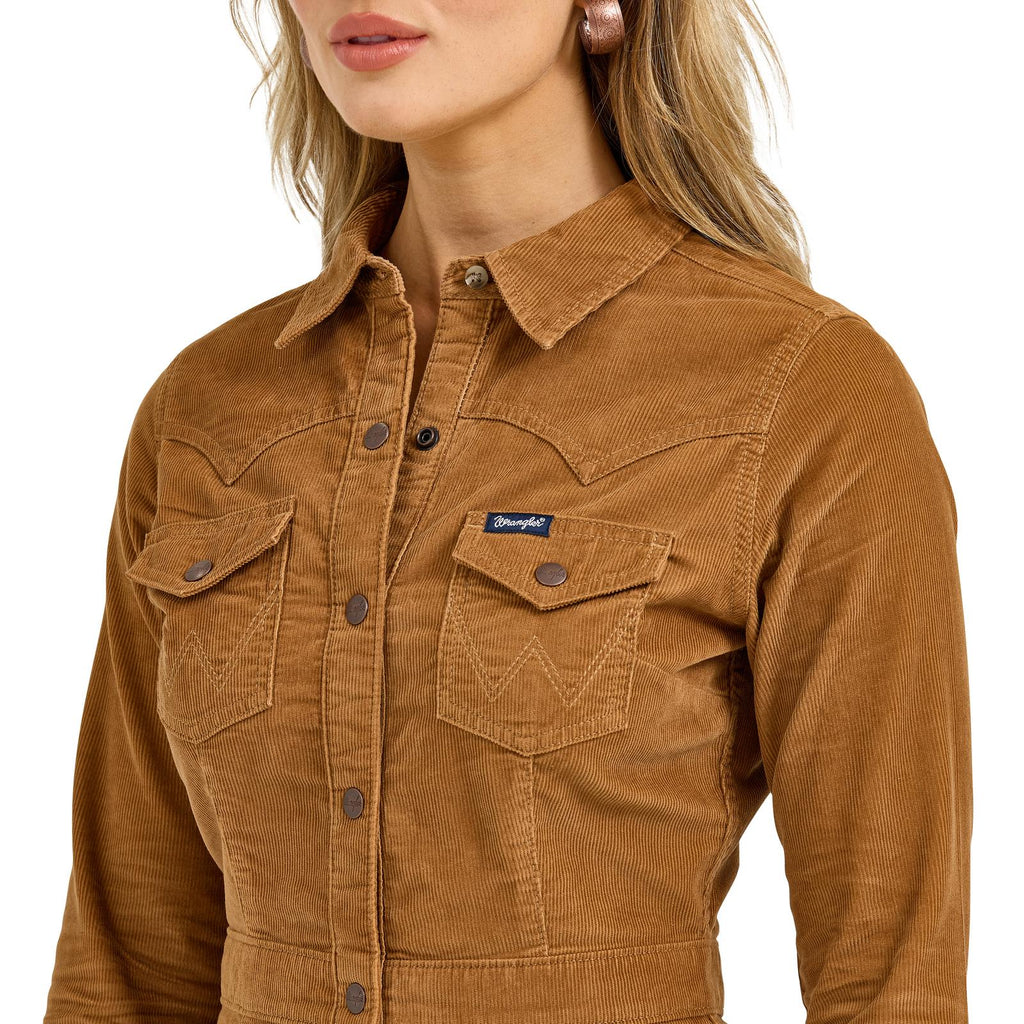 Cette robe-chemise western Wrangler Retro en velours côtelé pour femme est confectionnée en velours côtelé de coton léger et chaud, pour une douceur et un confort absolus. Elle arbore les mêmes détails emblématiques que vos chemises western préférées, notamment des empiècements à un seul point, des boutons-pression en cuivre vieilli et des poches poitrine à rabat ornées de la surpiqûre emblématique « W ». Cette robe à manches longues présente une coupe trapèze ultra-serrante, des plis et une ceinture à empiècements pour sublimer votre silhouette ; pas besoin de ceinture.