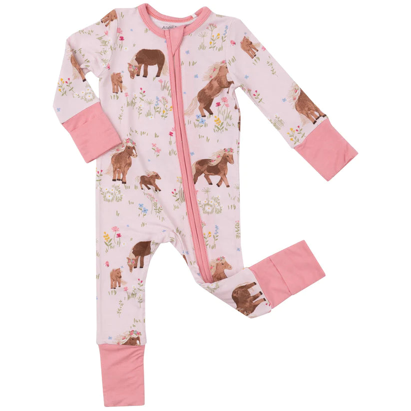 La barboteuse Watercolor Ponies pour bébé a des poignets rabattables qui aident à prévenir les égratignures accidentelles avec les ongles. La fermeture éclair double a une protection au menton. Les pattes de la barboteuse peuvent se replier au besoin pour recouvrir les pieds.