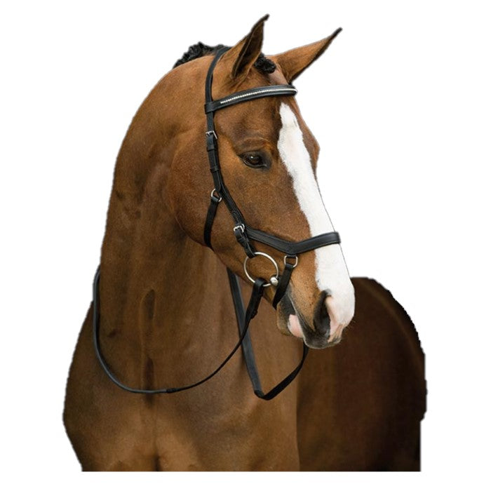 La bride Deluxe compétition diamant Rambo Micklem est tout simplement magnifique. Cette bride est conçu pour épouser la forme du crâne de votre cheval, évitant ainsi toute pression sur les zones sensibles. La bride Micklem est de qualité supérieure fabriquée à partir de cuir fini à la main avec rembourrage confort sur la tête, le frontal, la muserolle et les montants. Comprends les clips de protection et deux jeux de sangles. Ne peut pas être utilisé comme Caveçon sans bride ni fente. Cuir bombé et diamants sur le frontal. Couleur : Noir.