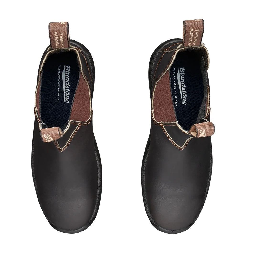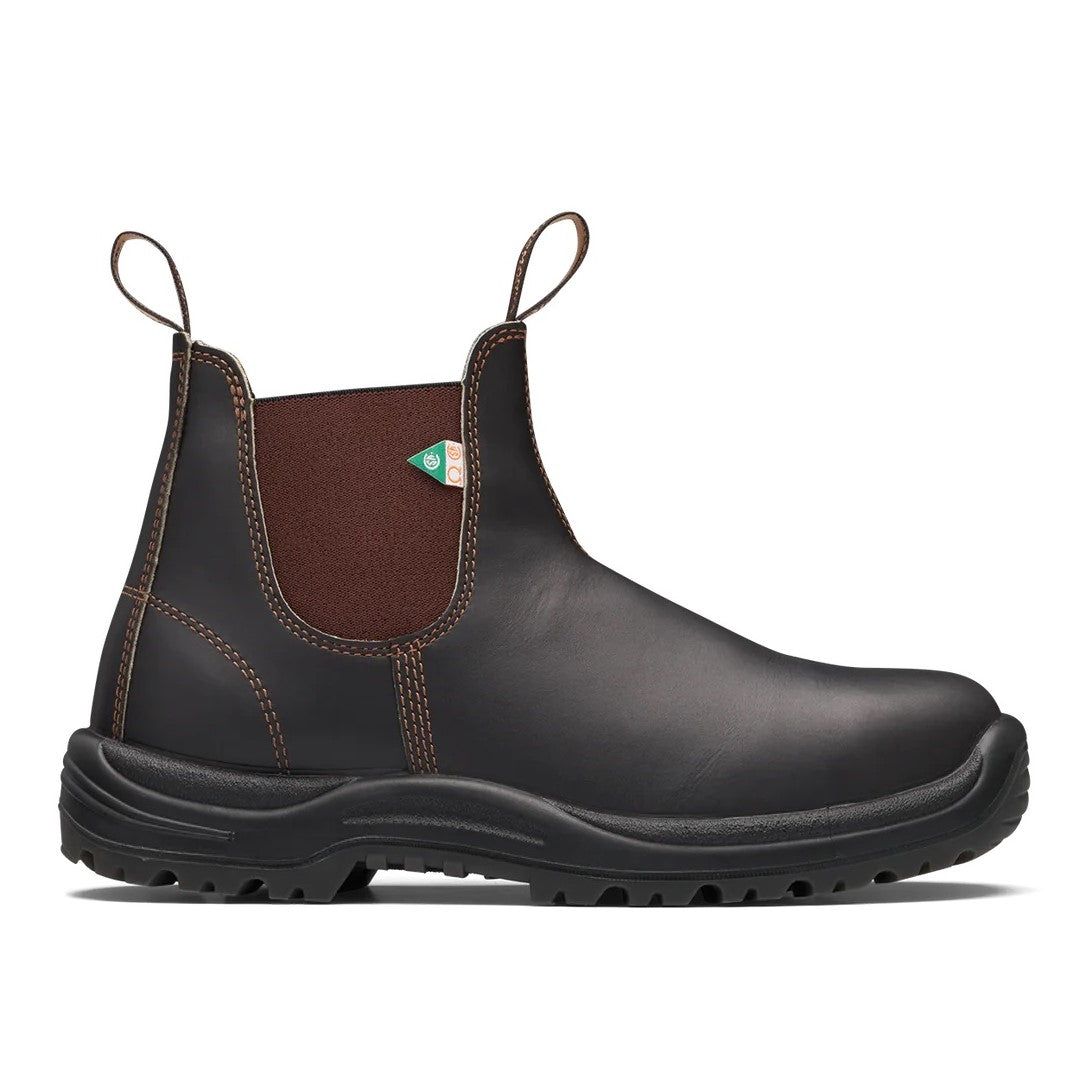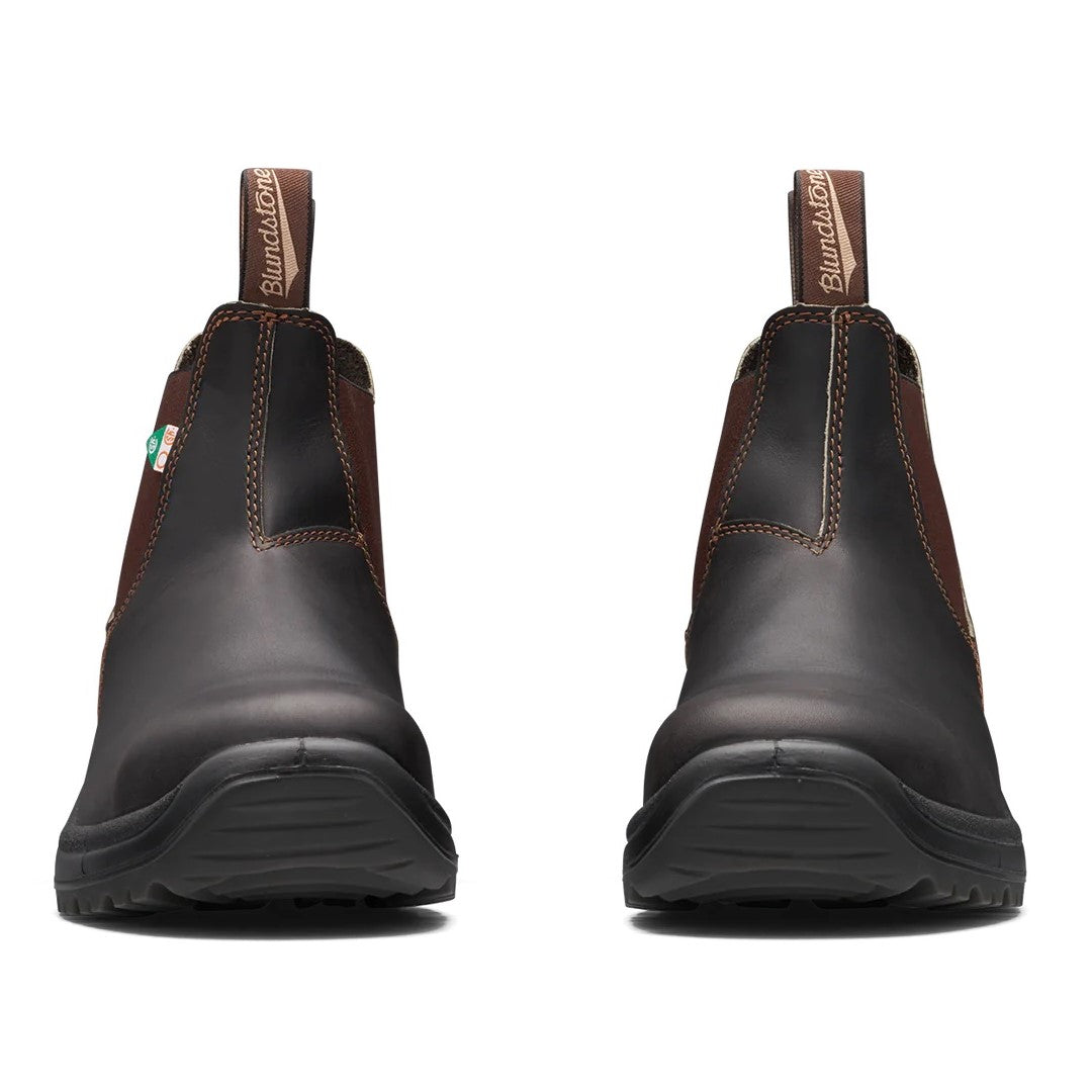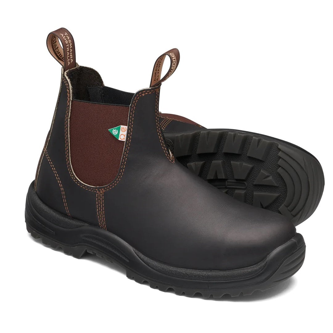 Bottes de travail Blundstone modèle 162 pour hommes. Avec la point du pied en acier Blundstone. Ces bottes vous offrent sécurité, confort et pied au sec toute la journée. Légères et durables avec une semelle résistante aux dangers électriques, chimiques et acides. Approuvé CSA Grade 1.