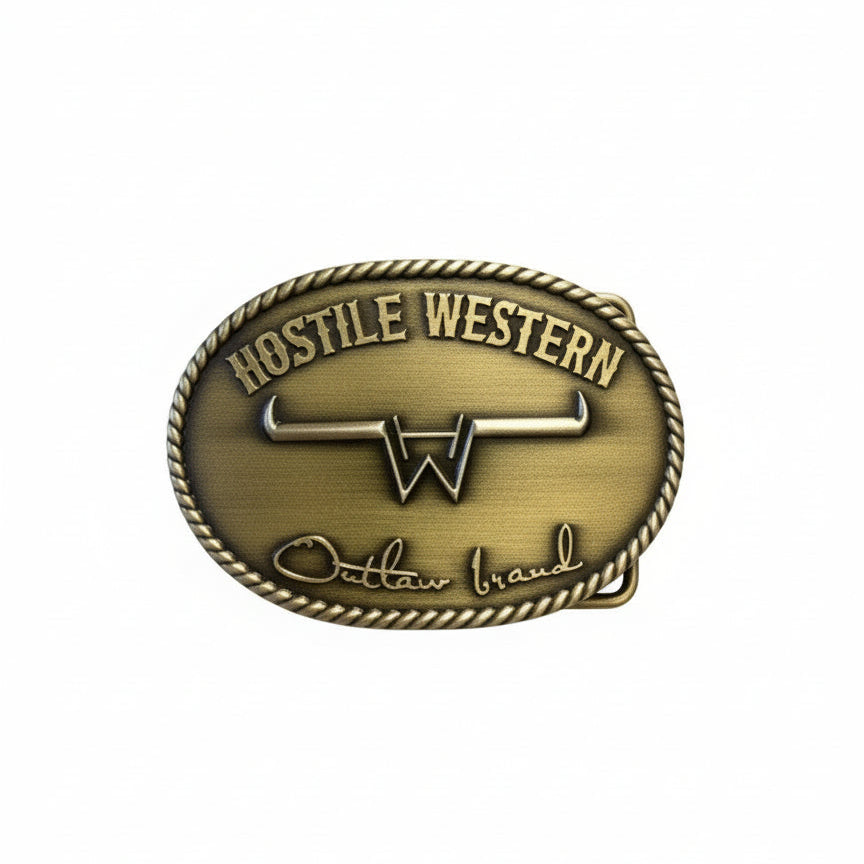 Boucle de ceinture Hostile Western. Fini doré. 10cm x 6.5cm.