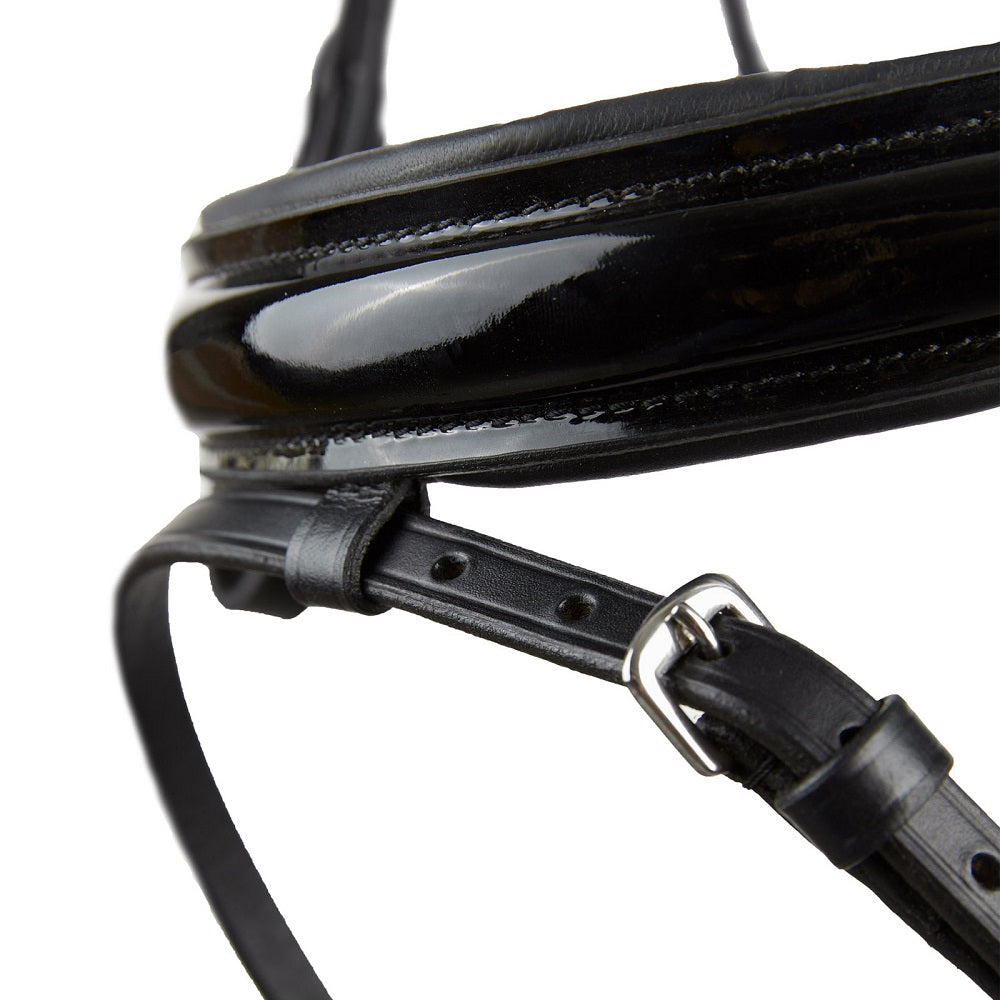 Bride de dressage Horze Grayson. Rembourrage confortable au frontal et à la muselière avec un accent de cuir accrocheur sur la muselière. Muselière à rabat avec flash amovible. Couleur noir.