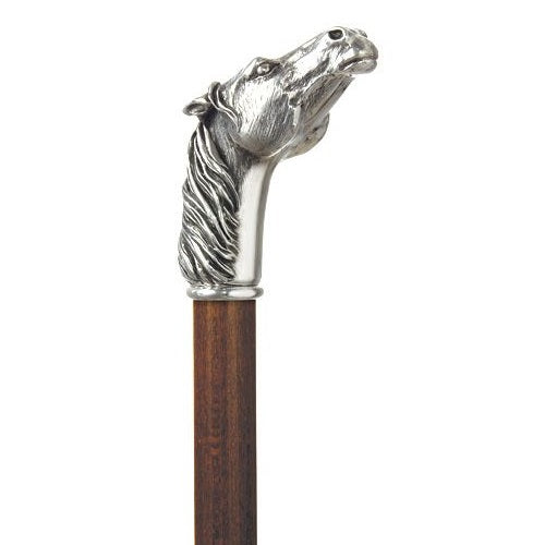 Canne Harvy provenant d'Italie, un manche tête de cheval en métal argenté monté sur un bois de hêtre naturel laqué. Longueur du manche de 36" qui se rétrécit de 3/4" à 5/8".