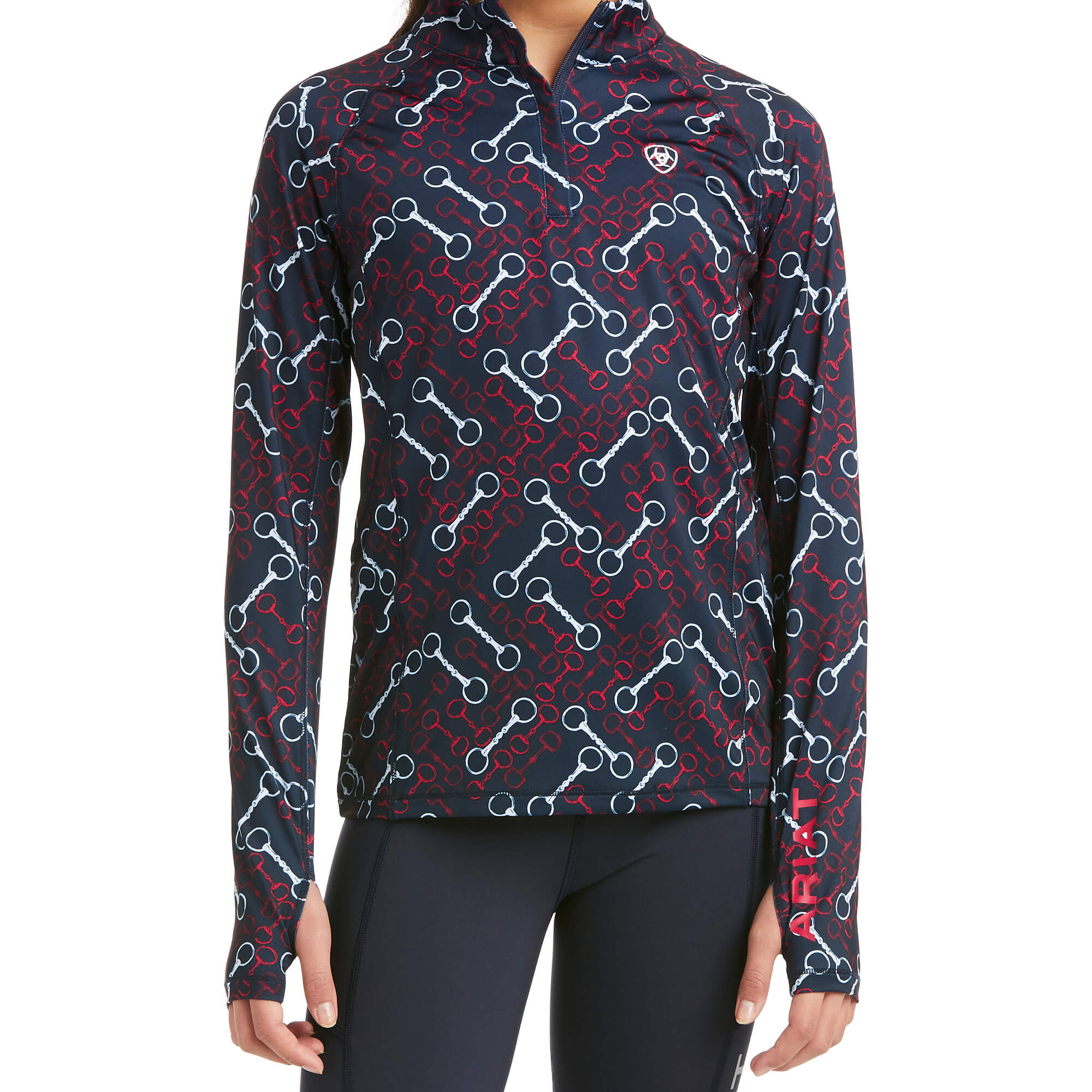 Chandail AriatTek pour fille conçu dans un jersey stretch brossé pour une liberté de mouvement. Il saura garder au chaud tout en évacuant l'humidité. Passe-pouces ergonomiques et col montant. Couleur; marine avec mors rouge et blanc en imprimés.