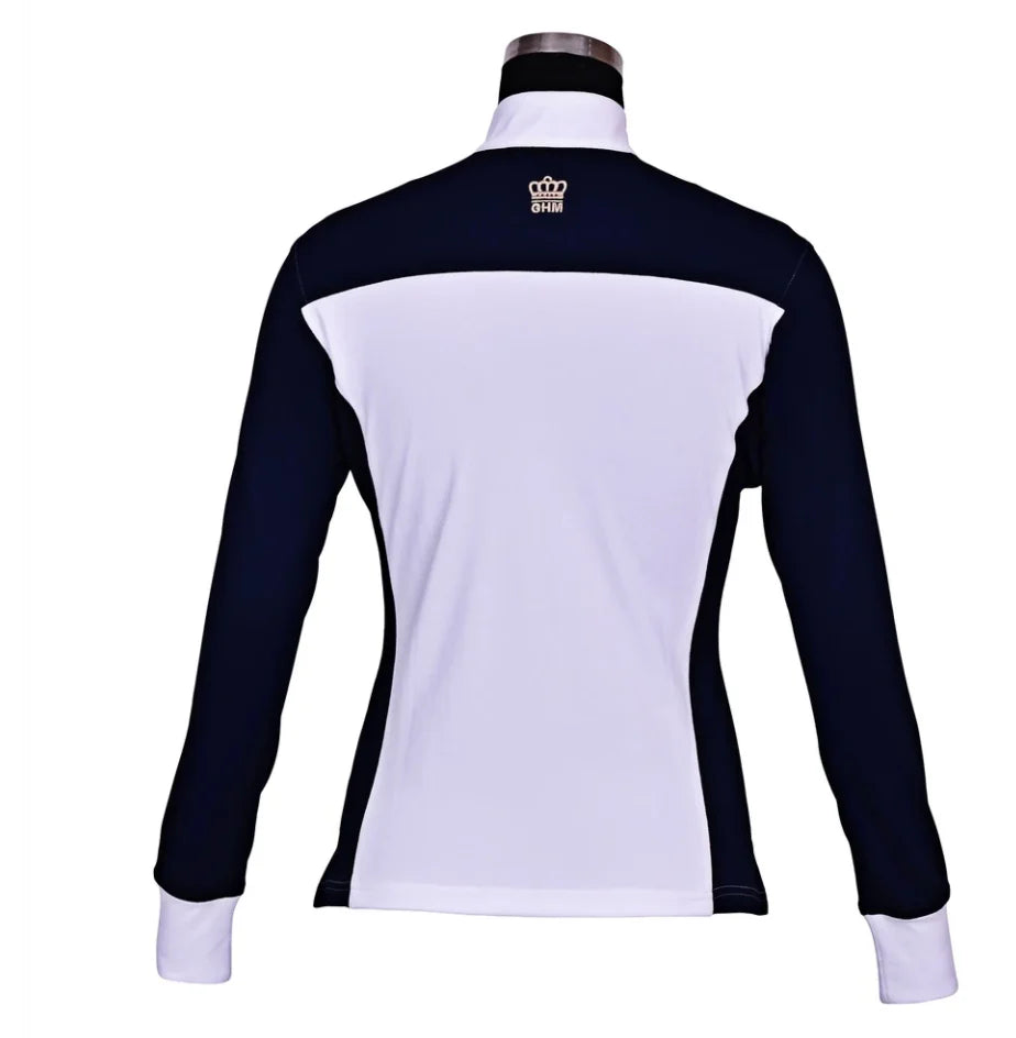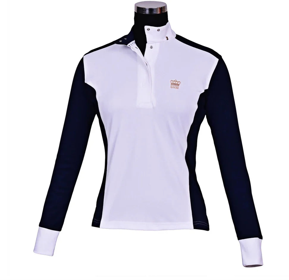 Chandail Champion GHM pour femmes à manches longues. Fermeture à boutons pressions à l'avant. Couleur marine et blanc. Conçu dans un tissu confortable et respirant.