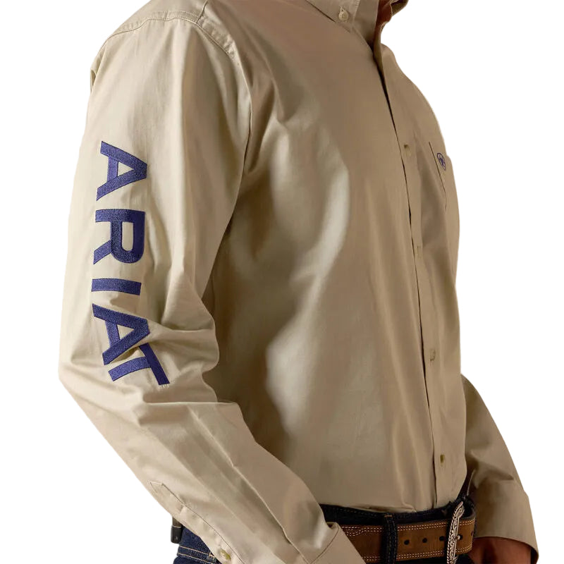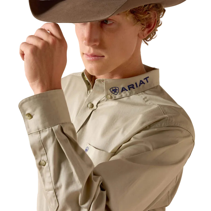 Chemise Ariat Team Logo Classic Fit pour hommes Couleur Khaki beige et broderie marine.