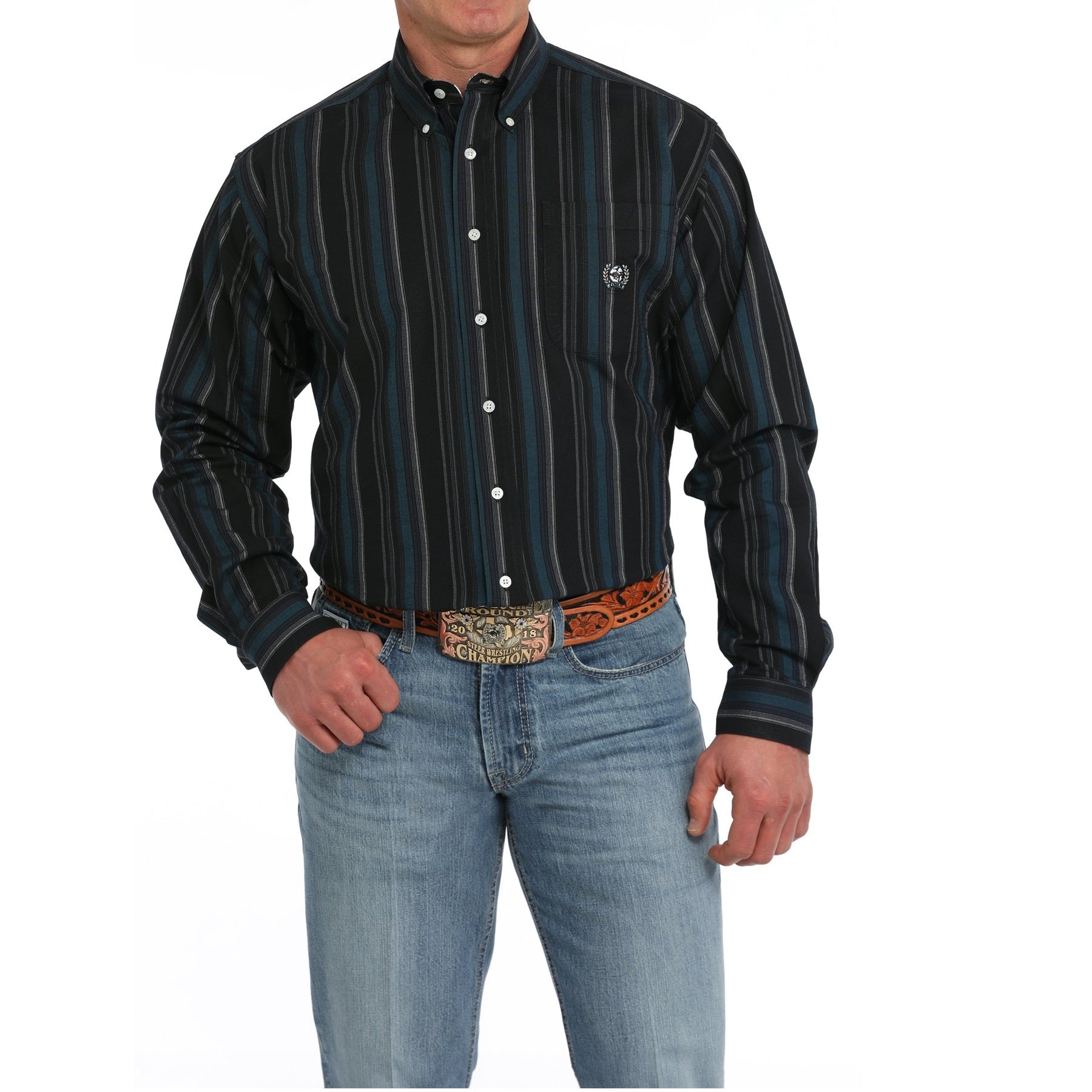 Chemise Cinch Oxford Stripe pour hommes. Noire en coton rayé teint. Égayez votre journée de travail ou vos soirées avec cette élégante chemise. Elle présente des rayures en denim contrastés, une poche avant gauche ouverte, un logo CINCH vintage brodé et des boutons blancs.