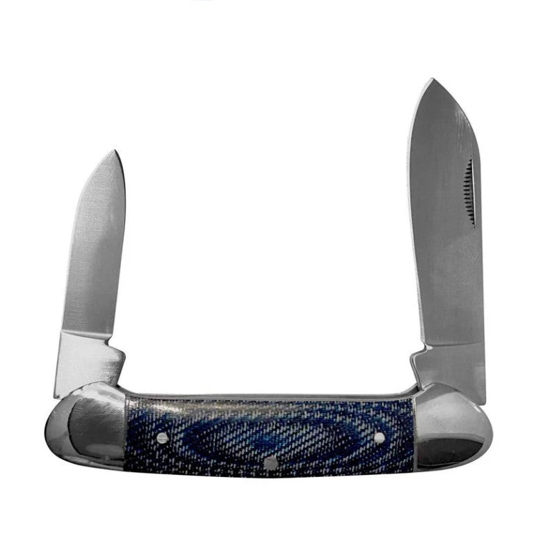 Ce couteau de poche Hooey Canoe en Micarta bleu denim est doté d'une lame de 5 cm et d'un manche de 7 cm.