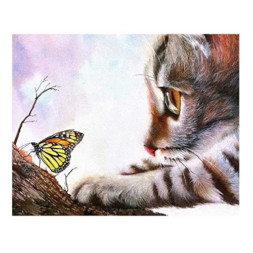 Peinture à numéros avec illustration de chaton et papillon. Dimensions: 50 cm x 40 cm. Des heures de plaisir et de détente! Pinceau inclus.
