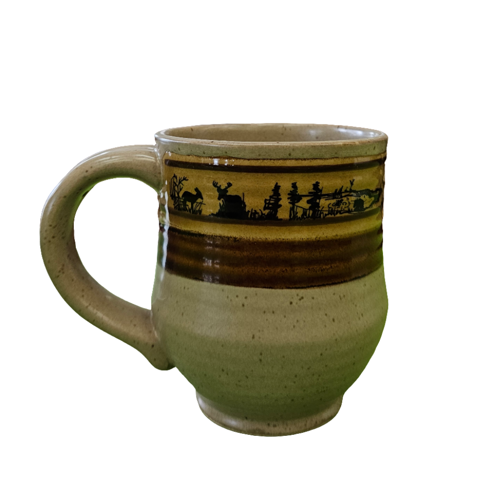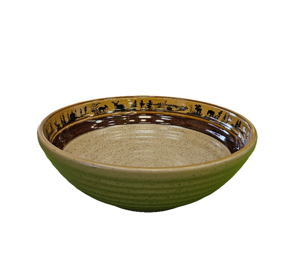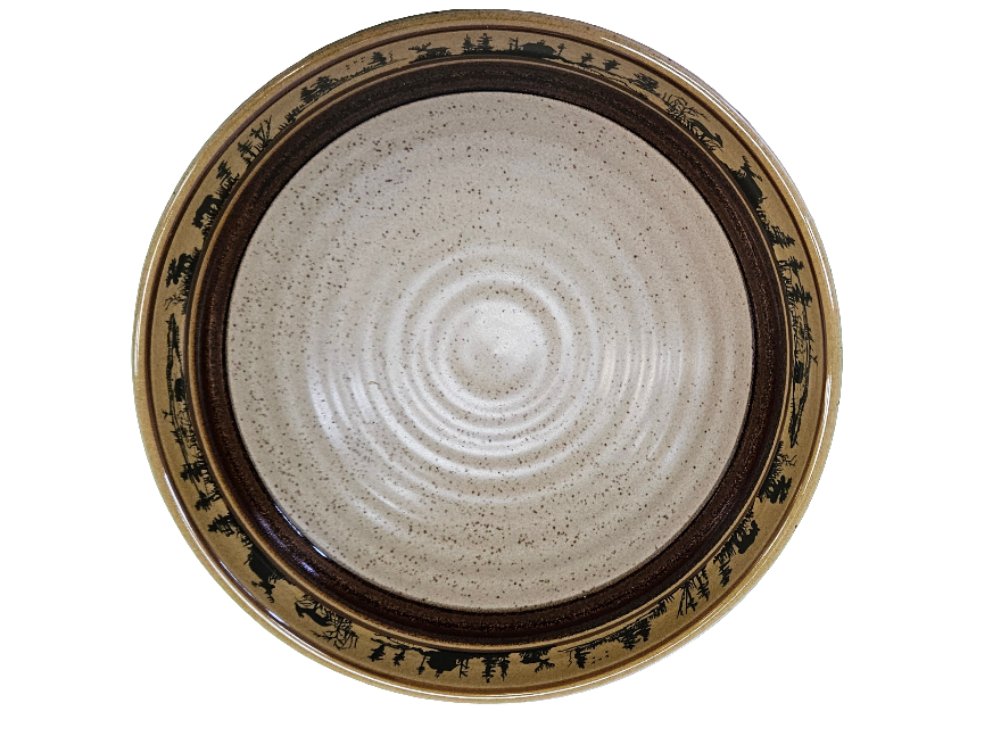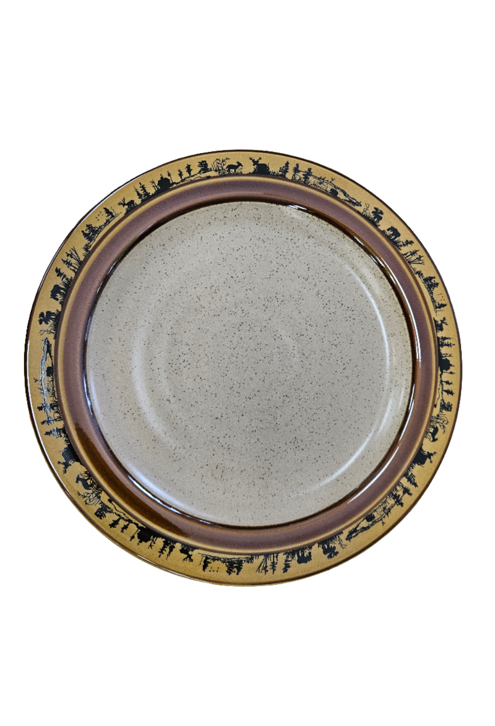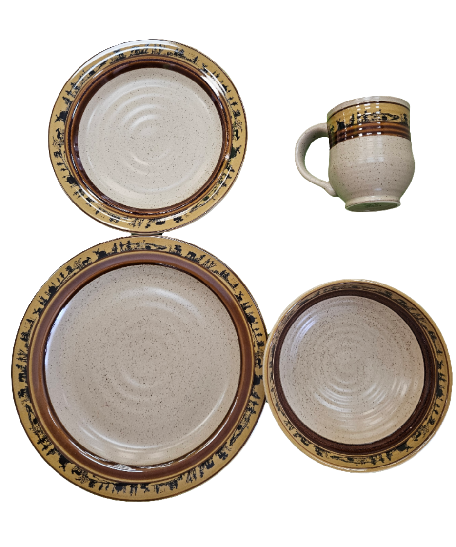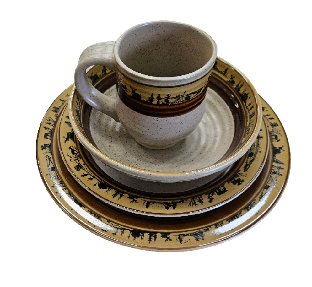 De la collection Earthart Cabin. Design par l'artiste canadienne Debra Durrer. Va au micro-ondes et au lave-vaisselle. Ensemble 16 pièces: 4 petites assiettes, 4 grandes assiettes, 4 bols et 4 tasses.