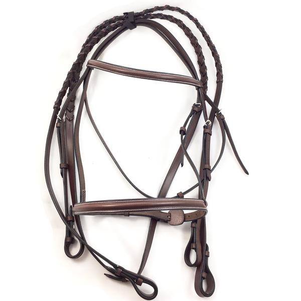 Ensemble de bride et rênes en cuir véritable de Henri de Rivel. Rênes tressées. Couleur oakbark.