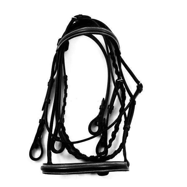 Ensemble de bride et rênes en cuir véritable de Henri de Rivel. Rênes tressées. Couleur noir.