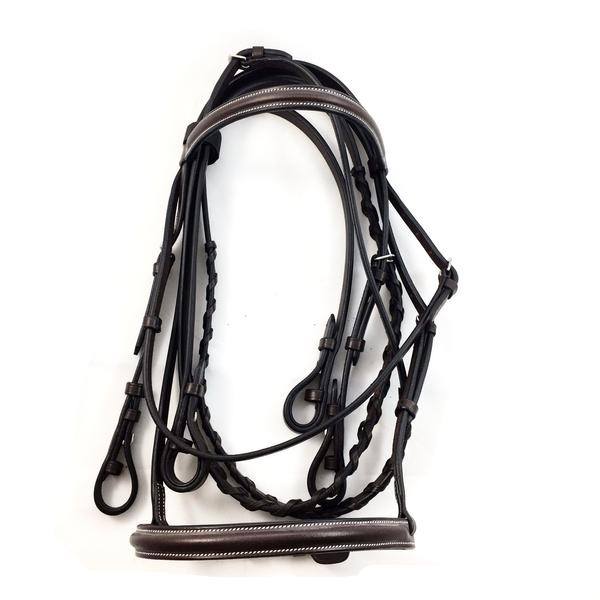 Ensemble de bride et rênes en cuir véritable de Henri de Rivel. Rênes tressées. Couleur havanah.