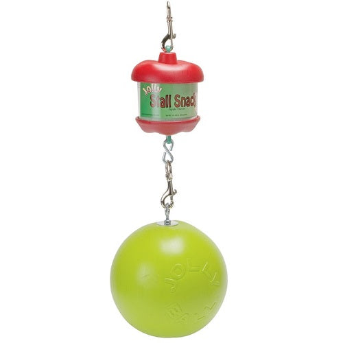 L'ensemble Jolly Stall Snack, avec sa Jolly Ball de 8" parfumée aux pommes, permet d'atténuer l'ennuie chez les chevaux. Une collation ou une gâterie Lkit peut être insérée dans le Jolly Stall Snack en forme de pommes. Gâterie vendue séparémment.