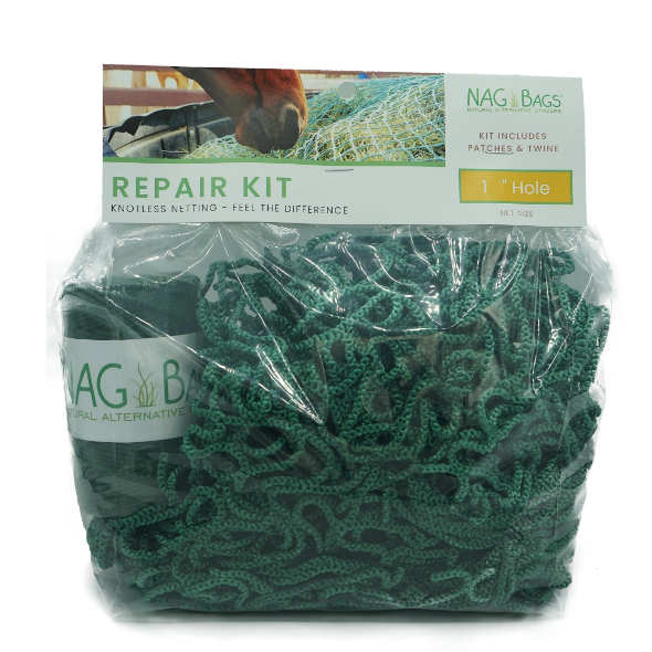 Ensemble de réparation pour les filets à foin Nag Bags. Trous de 1". Comprend 1 lbs de filet de remplacement et 1 rouleau de fil pour la réparation.