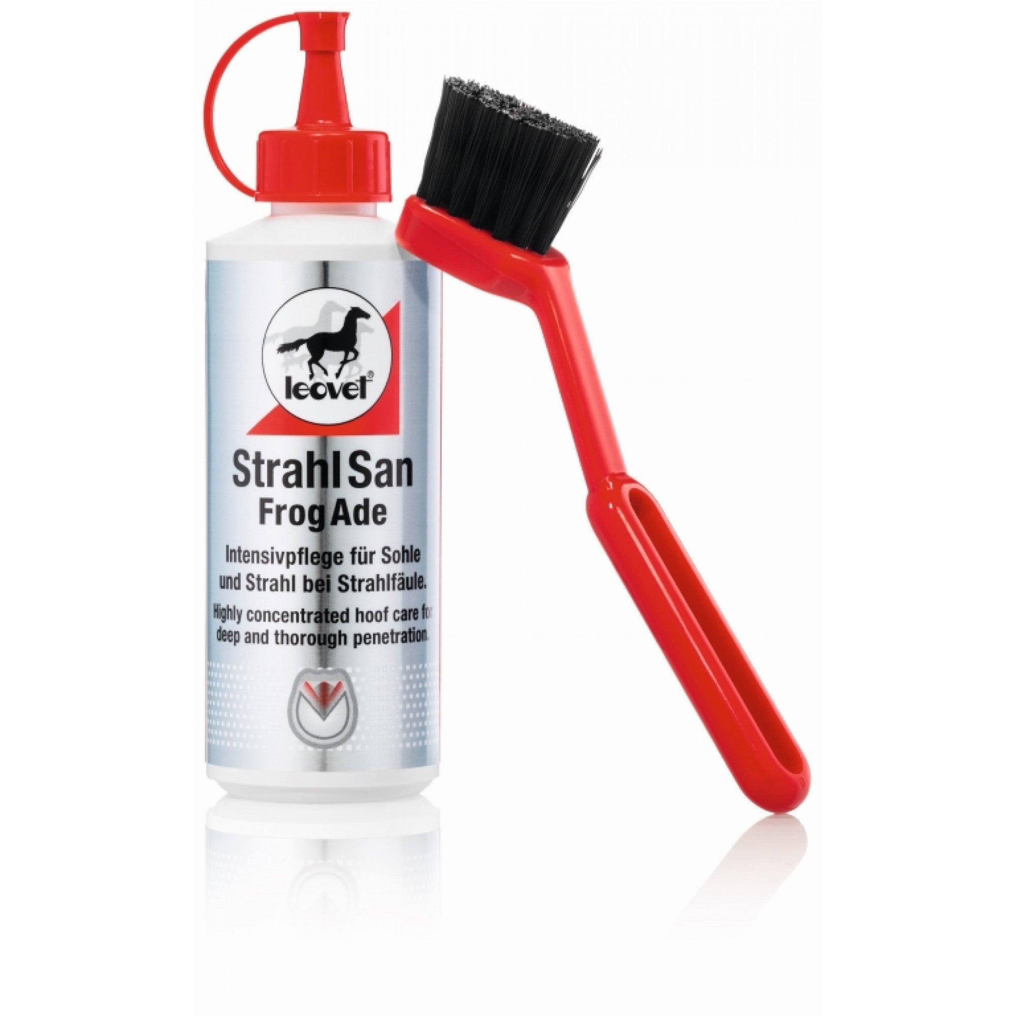 Le soin pour sabots Leovet Frogade, grâce à sa brosse incluse, facilite l'application et masse efficacement la sole et la fourchette. La corne pourrie est éliminée et la circulation sanguine est stimulée. La fourchette et la sole sont protégées contre toute nouvelle pourriture. FrogAde a également un effet préventif.