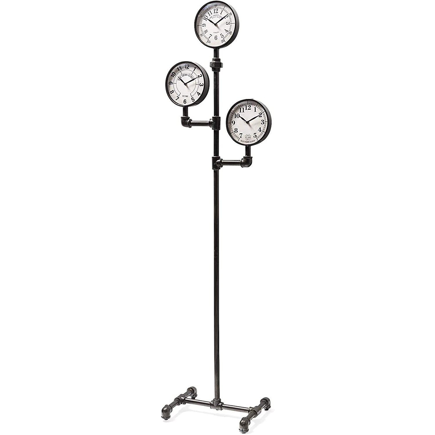 Inspiré des vieux tuyaux et jauges en fer, il comporte 3 cadrans d'horloge différents avec 3 designs de visage différents. Longueur 16'' Largeur 16'' Hauteur 72''.