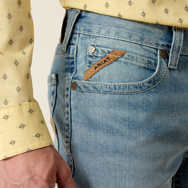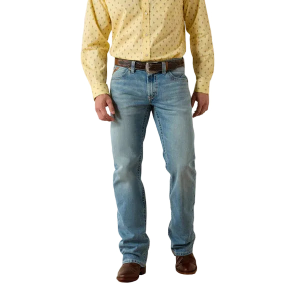 Jeans Ariat M4 Gus Boot pour hommes. Une version moderne d'un style classique. Confortable et résistant, le jean M4 à coupe bootcut est ample à la taille, aux hanches et aux cuisses pour une silhouette flatteus