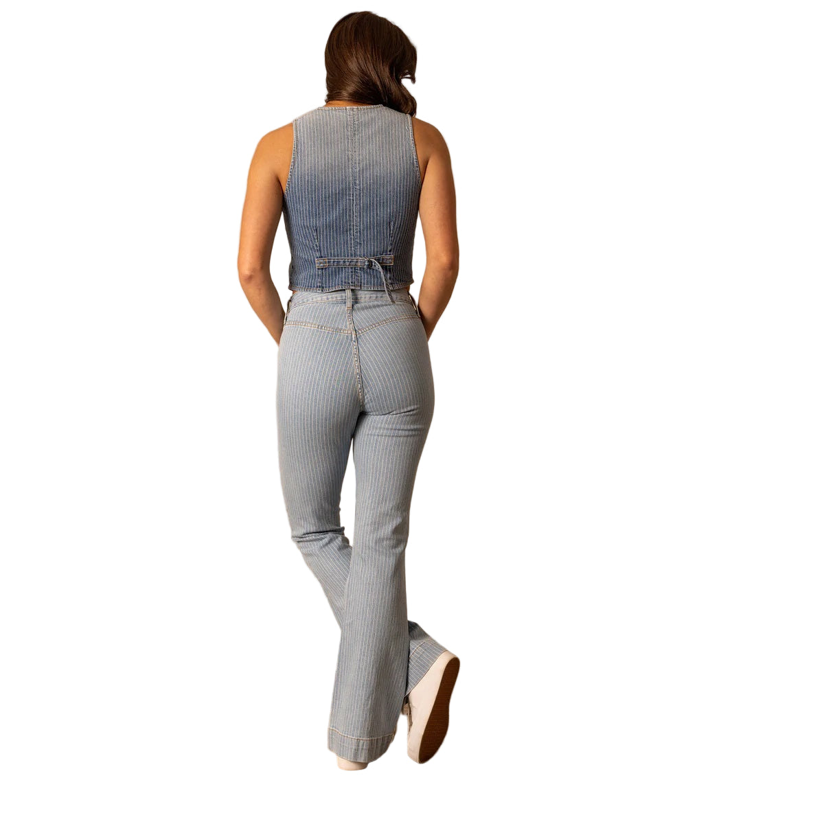- Détails : Denim délavé clair à fines rayures subtiles