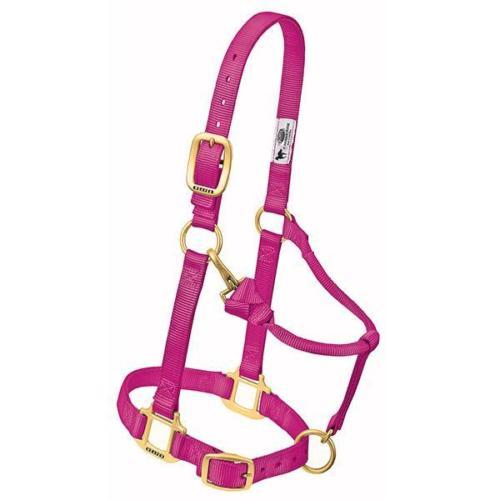 Licol en nylon et brass d'une largeur de 3/4" de Weaver Leather. Têtière et muserole ajustables. Suckling: 100-200 lbs. Weanling/Pony: 200-300 lbs. Arabian/cob: 500-800 lbs. Miniature/Average: 50-150 lbs.