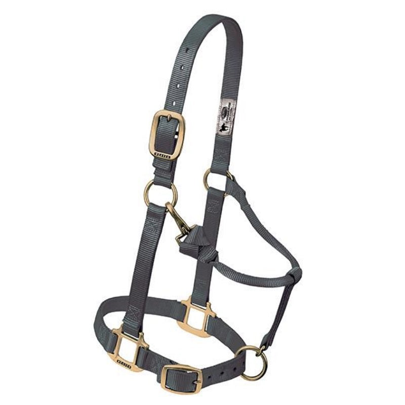 Licol en nylon et brass d'une largeur de 3/4" de Weaver Leather. Têtière et muserole ajustables. Suckling: 100-200 lbs. Weanling/Pony: 200-300 lbs. Arabian/cob: 500-800 lbs. Miniature/Average: 50-150 lbs.