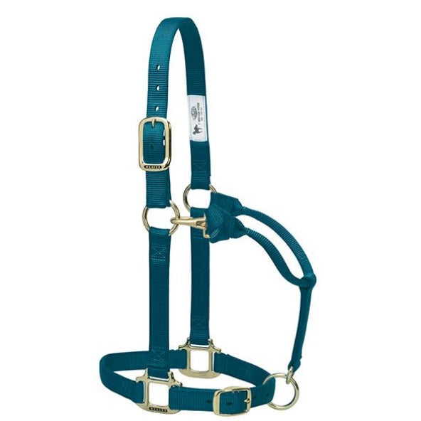 Licol en nylon et brass d'une largeur de 3/4" de Weaver Leather. Têtière et muserole ajustables. Suckling: 100-200 lbs. Weanling/Pony: 200-300 lbs. Arabian/cob: 500-800 lbs. Miniature/Average: 50-150 lbs.