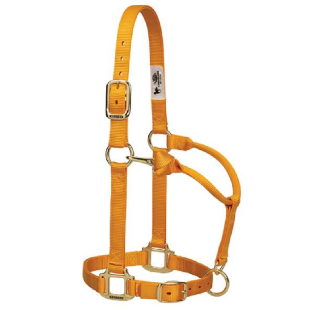 Licol en nylon et brass d'une largeur de 1'' de Weaver Leather. Têtière et muserole ajustables. Yearling: 300-500 lbs.  Small : 500-800lbs, Average : 800-1100 lbs, Large : 1100-1600 lbs.