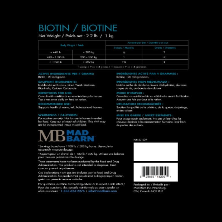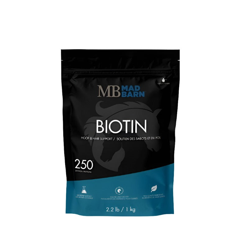 La biotine est une vitamine B hydrosoluble qui favorise la solidité des sabots et des tissus conjonctifs tels que les ligaments et les tendons. La biotine est nécessaire à la synthèse de la kératine et favorise la santé du pelage et de la peau. Une supplémentation de 20 mg par jour peut améliorer la croissance et la qualité des sabots.