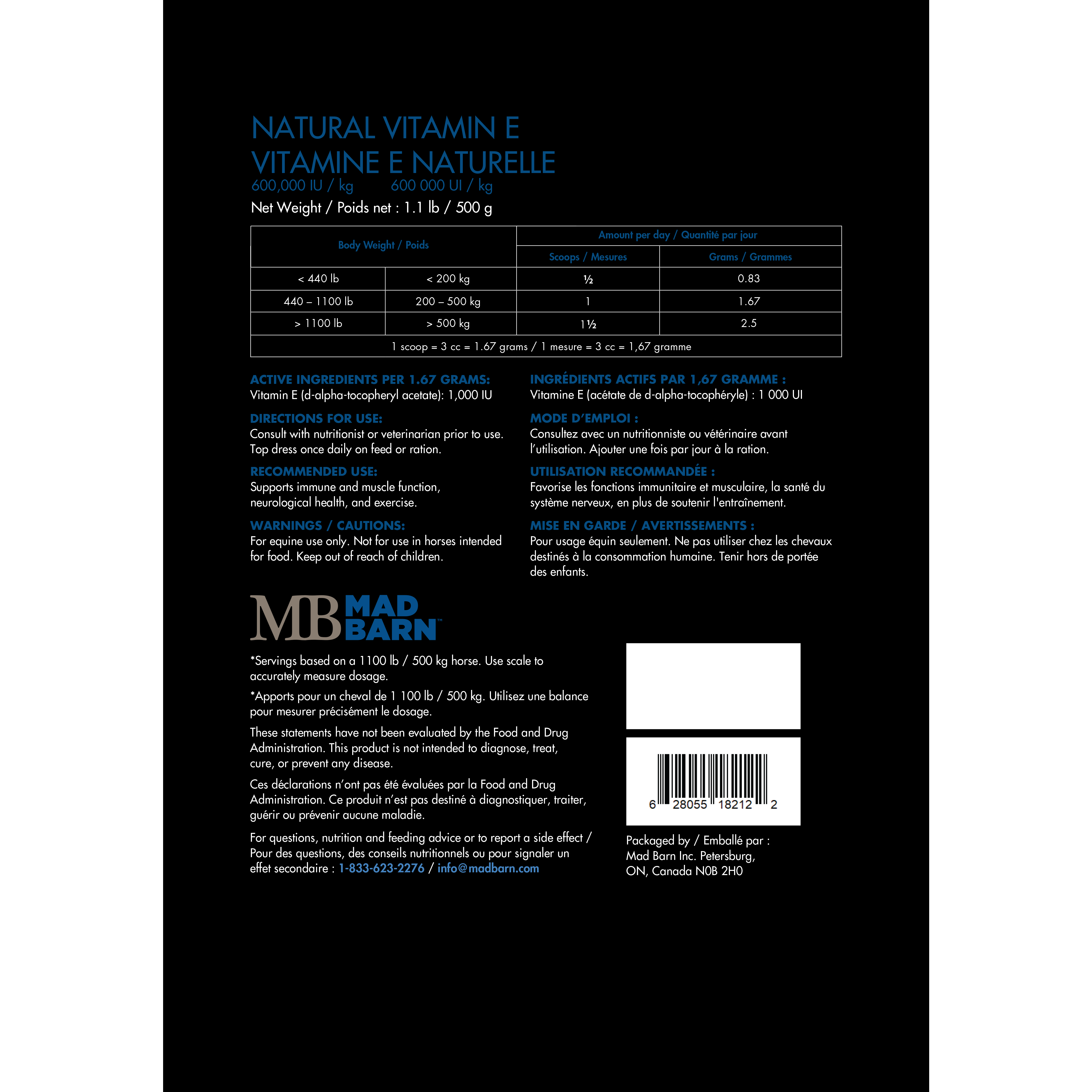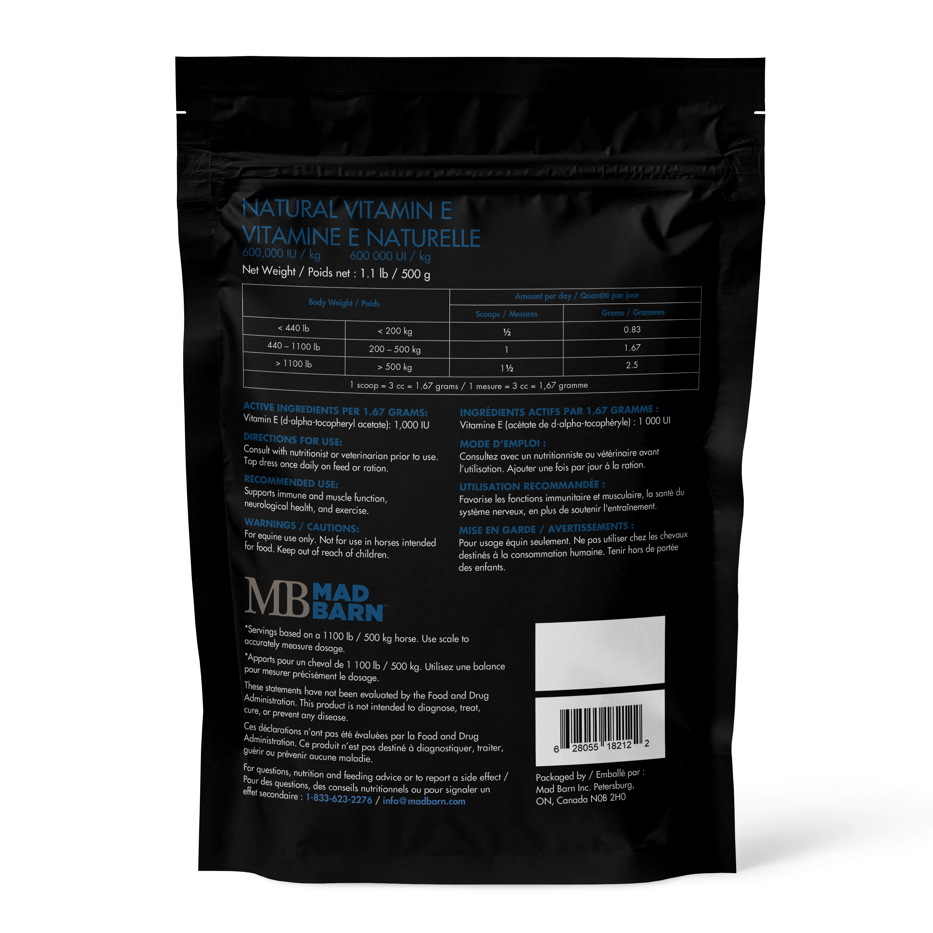 La vitamine E est essentielle à la fonction immunitaire des chevaux, à la santé cardiovasculaire, à la fonction musculaire, à la récupération après un exercice physique et à la santé neurologique. La vitamine E est surtout connue pour son rôle d’antioxydant chez les chevaux, qui protège toutes les cellules et tous les tissus des dommages oxydatifs. Notre supplément de vitamine E naturelle fournit ce nutriment sous une forme qui est le plus efficacement absorbée et utilisée dans les tissus. Contient 300 portions