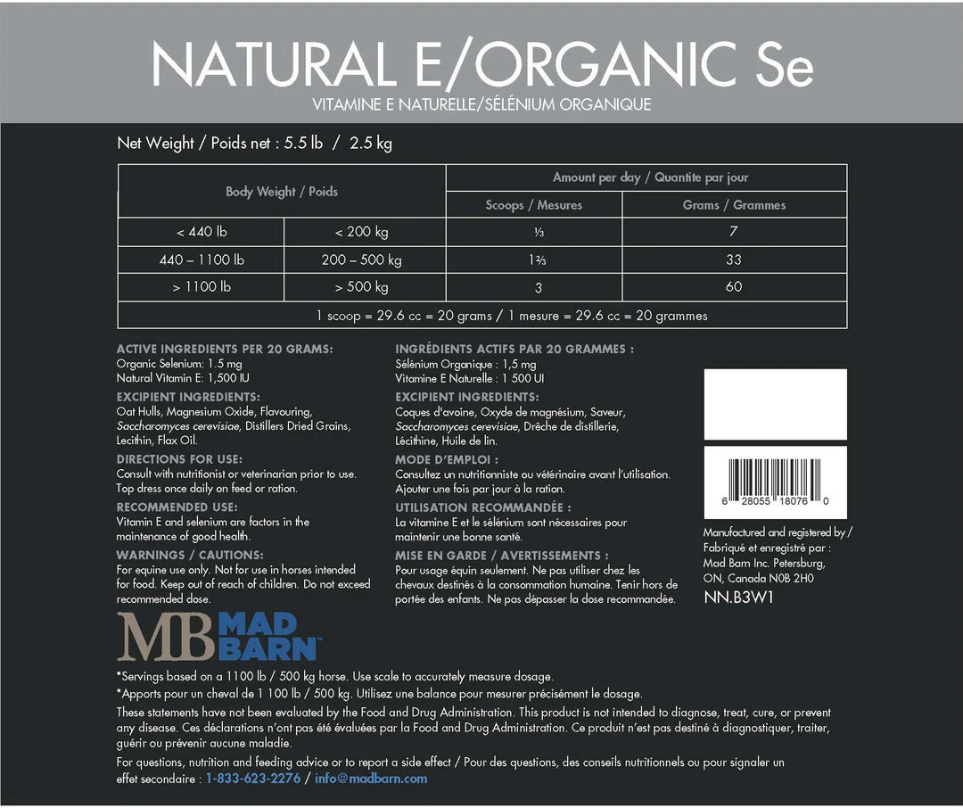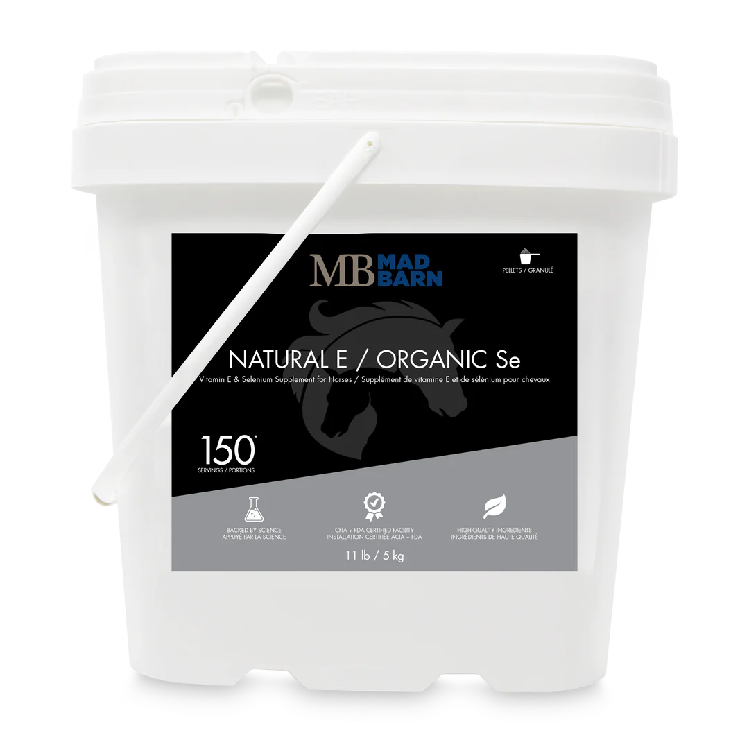 Natural E/Organic Se est un supplément en granulés qui est une combinaison hautement biodisponible de vitamine E naturelle et de sélénium organique pour soutenir un statut antioxydant optimal chez votre cheval. Ce supplément appétent aide à maintenir la fonction musculaire, le système immunitaire et la récupération après l’effort, en particulier lorsque le pâturage frais n’est pas disponible.