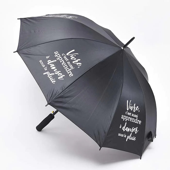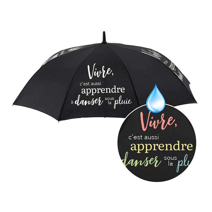 Parapluie "Danser sous la pluie" de la collection de Chantal Lacroix. Le texte change de couleur au contact de l'eau.