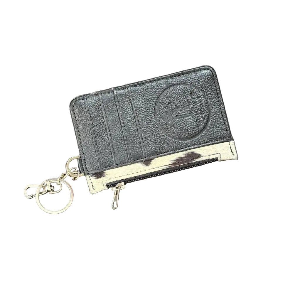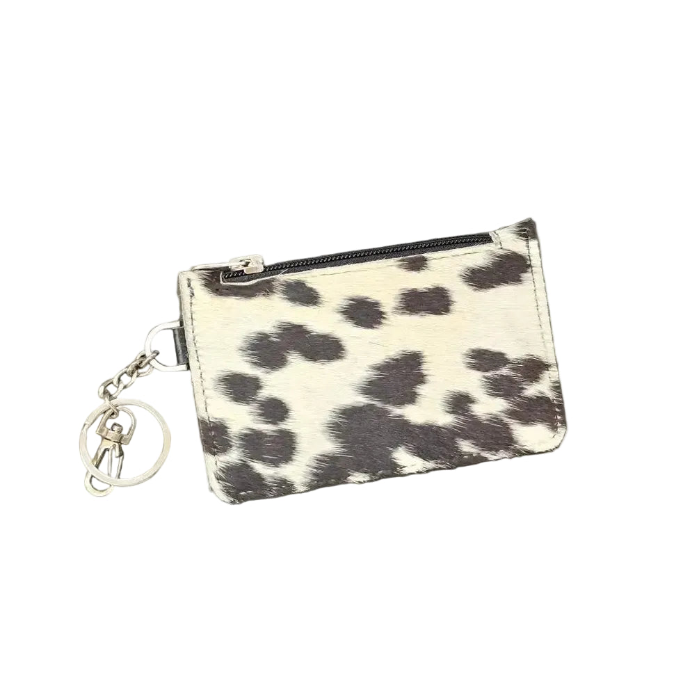 Porte-clés/Portefeuille en cuir de vache avec poils. Vraiment unique en son genre, chaque pièce met en valeur les variations naturelles du véritable cuir de vache. Compact mais fonctionnel (13,34 cm x 8,51 cm), il contient des cartes, de la monnaie et des clés grâce à ses 5 emplacements, sa pochette à monnaie zippée et son fermoir mousqueton sécurisé.