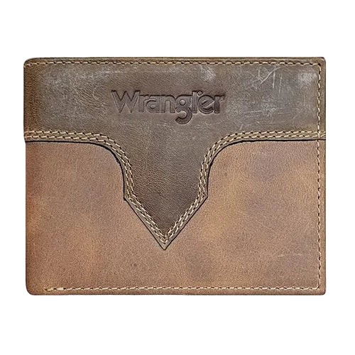 Portefeuille à deux volets Wrangler. Corps en cuir Crazy Horse avec revêtement en cuir embossé Wrangler.