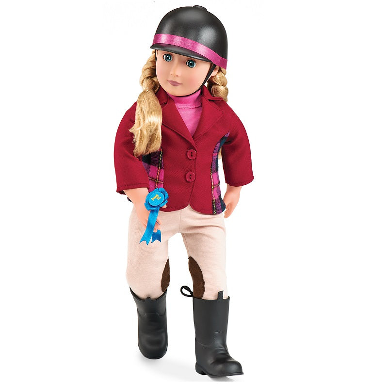 Une poupée articulée de 46 cm avec 2 ensembles complets de vêtements. Comprend les vêtements de cavalière : veste, pantalons, bottes, t-shirt col roulé, casque et bas. Comprend 1 une belle robe de soirée et 1 paire de souliers. Comprend également tout le nécessaire pour opérer un kiosque à limonade.