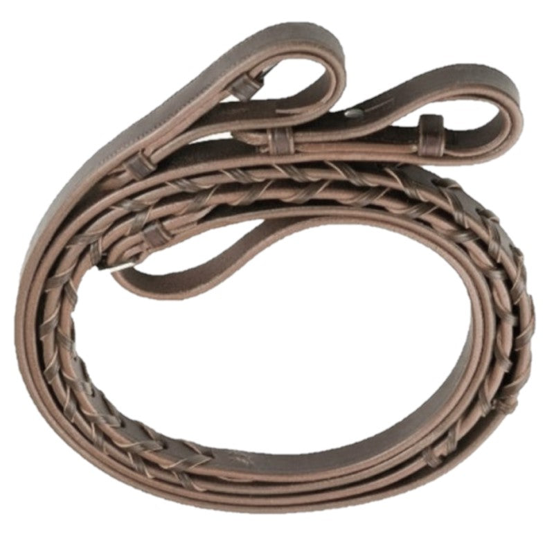 Rênes HDR en cuir véritable tressées. Dimensions: 60'' de long. 5/8'' de largeur. Couleur: Havana.
