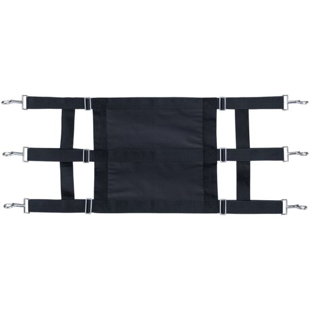 Ce rideau de porte est fabriquée de sangles poly/nylon ultra-résistantes de 5 cm de large et est munie de 3 mousquetons de chaque côté pour la fixation au box. Elle est également équipée de boucles coulissantes permettant d'ajuster la largeur de 91 à 122 cm.