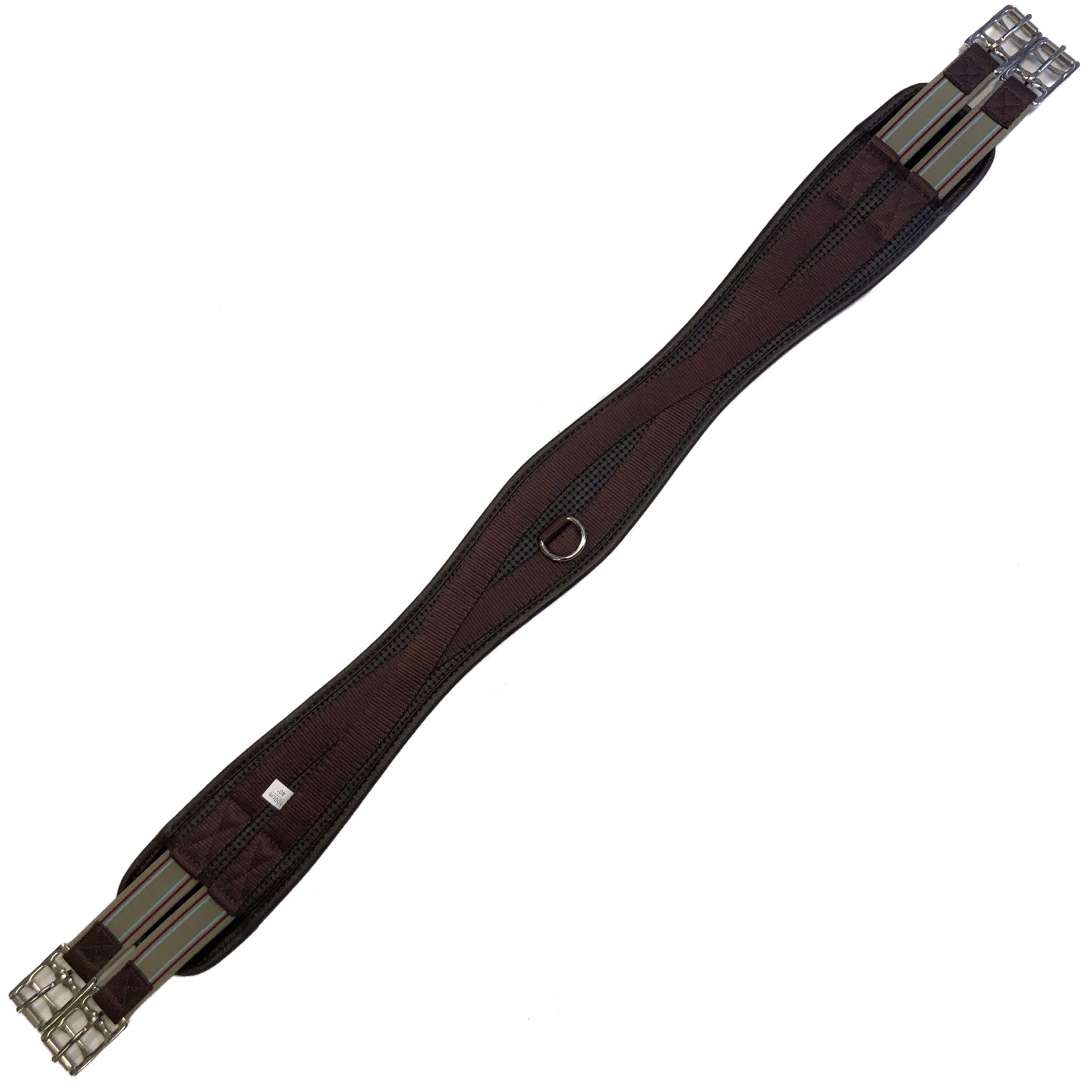 Sangle pour selle classique avec un élastique à chaque extrémités et un anneau central. Couleur brune.