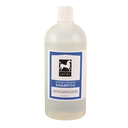Shampoing et revitalisant hypoallergène Jacks. Format 946 ml. Formule concentrée sans fragrance ni parfum, qui nettoie en profondeur et enlève la poussière.
